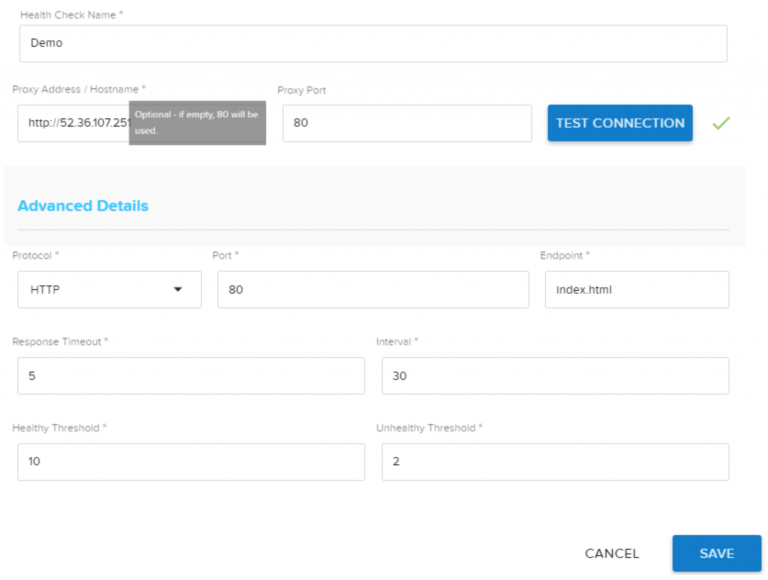 • Timeout: The timeout (in seconds) to wait for each instance to answer the check. If it did not answer, we mark this attempt as unhealthy