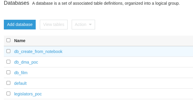 You can list the tables within a database with spark.sql("SHOW TABLES db_film")