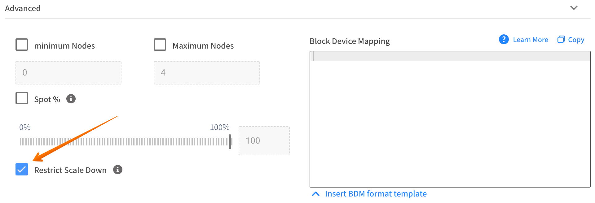 cautionUnder normal operation, Auto-scaling should be enabled, and it is not recommended to disable this function. When Auto-scaling is disabled, Ocean does not scale up or down and cannot maintain headroom. In addition, the Cluster Shutdown Hours feature will not work properly when scaling the cluster back to its desired state.